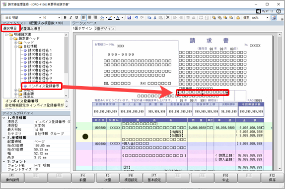 配置した「インボイス登録番号」を選択した状態で[F6:項目設定]を押し、[表示形式]ページで、「接頭文字列」を設定します。