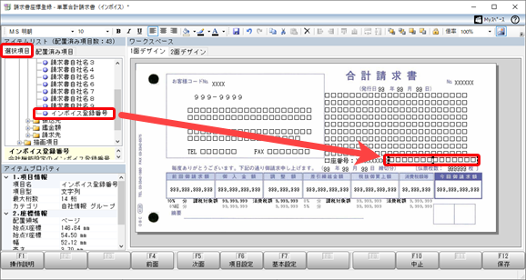 配置した「インボイス登録番号」を選択した状態で[F6:項目設定]を押し、[表示形式]ページで、「接頭文字列」を設定します。 - 「請求期間」を配置します。