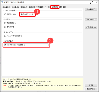 - [出力設定]ページで、ファイルの種類を「Excelファイル」に設定します。