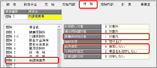 - [導入処理 - 給与体系登録 - 勤怠支給控除項目登録 - 勤怠支給控除項目登録]メニューの[控除]ページで、年調精算用の控除項目を登録します。