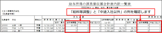 給与所得等⽀給状況内訳書には「給料等調整」や「中途⼊社以外」の⾦額が集計されないため、法定調書合計表と⼀致しません。