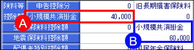 - 「A」には、[年末調整 - 年末調整処理 - 年末調整処理]メニューの[所得控除等]ページで入力した、「小規模共済掛金」の金額が表示されます。