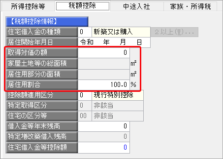 令和 1年から令和 3年に住宅を取得した場合(居住開始年月日が平成31年 1月 1日から令和 3年12月31日)の[年末調整 ‐ 年末調整処理 ‐ 年末調整処理]メニューの[税額控除]ページの入力方法を説明します。