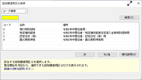 住宅借入金の種類・居住開始年月日を入力してから、控除額適用区分欄で[Space]キーを押すと、[控除額適用区分検索]画面が表示されます。