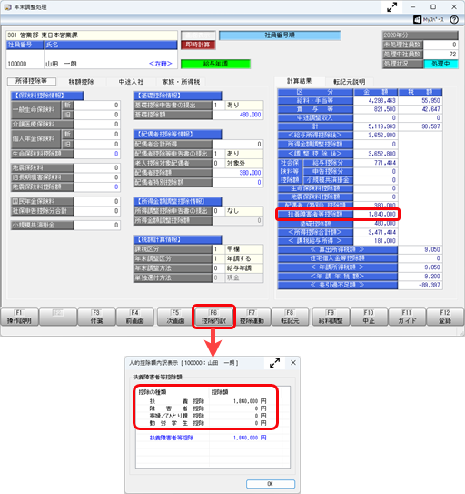 - 該当の社員を表示して[F6:控除内訳]を押し、[人的控除額内訳表示]画面で確認します。