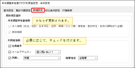 - [年末調整申告書クラウド利用者設定 - 条件設定]画面の[基本設定]ページで「利用者情報の更新」を選択します。